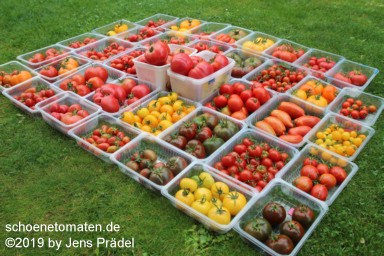 Geplant waren 72 Tomatensorten. 16 Sorten davon wollte ich zum zweiten Mal anbauen. 24 Pflanzen wollte ich auf Tomatenunterlagen veredeln. Hierfür hatte ich 3 verschiedene Tomatenunterlagen zum Vergleich ausgewählt. Nachdem ich die Planung mehrfach noch geändert hatte, wurden es letztendlich 68 verschiedene Sorten. Es gelang mir 11 Pflanzen auf eine Tomatenunterlage zu veredeln. Da es der zweite trockene und heiße Sommer in Folge war, waren die Ernteerträge gewaltig. Mit 263 kg wurde mein bisheriges Rekordjahr 2006 um etwa 23 kg übertroffen.