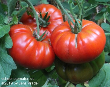 große Pflanze (1,8 bis 2,2 m) später Erntebeginn (Ende August) trotzdem sehr reicher Ertrag von durchweg gigantischen Früchten sehr große, breitrunde, leicht gerippte oder gedellte (da nicht zu saftig), rosarote Früchte größte geerntete Frucht: 685 g (2012), 671 g (2019) kräftiges Tomatenaroma, sehr fleischig Eine empfehlenswerte Sorte für Liebhaber von Riesenfleischtomaten! |