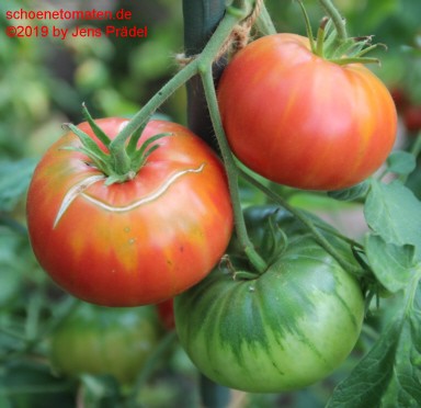 große Pflanzen (2 bis 2,5 m) früher Erntebeginn (Anfang August) außerordentlich ertragreich sehr große, flache, breitrunde, gerippte, feuerrot-grün gestreifte Früchte, oft auch ungewöhnliche Formen Die rot-gelbgrüne Maserung durchzieht auch das Innere der Früchte. größte geerntete Frucht (2008): 562 g größte geerntete Frucht (2012): 445 g größte geerntete Frucht (2019): 351 g ausgezeichneter, fruchtig-aromatischer Geschmack, sehr saftig Der Anbau dieser Sorte gestaltete sich 2007 etwas problematisch, war dafür 2008 und 2012 um so erfolgreicher. Diese Sorte braucht einen guten, sonnigen Standort. ungewöhnliches Aussehen, wunderbarer Geschmack und ertragreich - eine außergewöhnliche Tomate! |