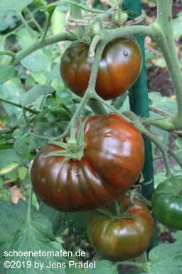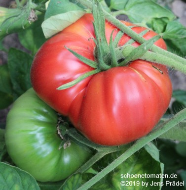 mittelgroße (bis 2 m) Pflanzen später Erntebeginn (Ende August) sehr ertragreich große bis sehr große (ø 10 bis 13 cm), breitrunde, unregelmäßig gerippte, teilweise auch herzförmige, hellrote bis rosafarbene Früchte schwerste geerntete Frucht: 365 g (2010), 589 g (2019) schöner, würziger Geschmack Prima Sorte! |