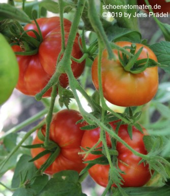 kleinere Pflanzen (1,5 m) sehr später Erntebeginn (Mitte September) dadurch geringer Ertrag relativ kleine, breitrunde und ziemlich gleichmäßig im Kragenbereich gerippte, rote Früchte größte geerntete Frucht: 165 g schöner, süßlicher Geschmack, fleischig In besseren Tomatenjahren ist eine frühere Ernte von Früchten um 500 Gramm zu erwarten. |