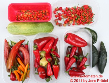 Chili: Fresno, Fireflame, Kleiner Ungar, Abbreviatum, Filius Blue, Serrano, Rühlemanns Mini-Chili, Chupetinha, Habanero orange, Elefant, Bonsai-Chili