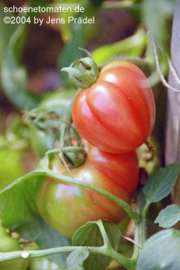 2006 waren die Früchte eher rot mit orangefarbenen Flecken und unterschiedlichen Formen in einer Traube: sowohl breitrund gerippt als auch herzförmig