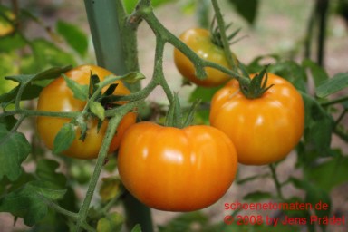 mittelgroße Pflanze (1,6 bis 2 m) mittelfrüher Erntebeginn (Mitte August) relativ geringer Ertrag große, breitrunde, kaum gerippte, orangefarbene Früchte mit meist der Sonne zugewandten roten Bäckchen größte geerntete Frucht: 405 g saftiger, obstiger Geschmack eine schöne und leckere Tomate! |