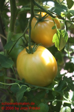 große Pflanze (über 2 m) mittelfrüher Erntebeginn (Mitte August) guter Ertrag riesige, breitrunde, unregelmäßig gekerbte, hellgelbe Früchte mit kleinen orangefarbenen Streifen im Kragenbereich (Fruchtboden fast weißgelb) größte geerntete Frucht: 899 g mildsüßer Geschmack, sehr saftig für Liebhaber großer, gelber Tomaten! |