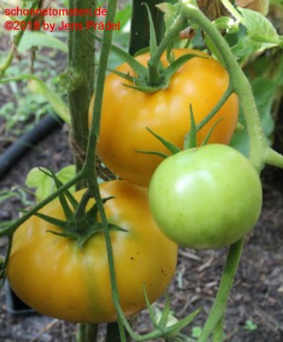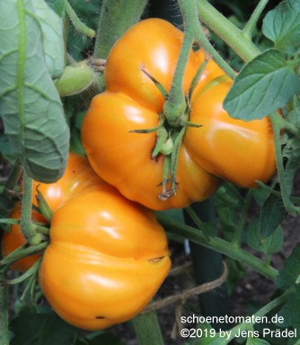 mittelgroße, kartoffelblättrige Pflanzen (1,5 bis 1,8 m) später Erntebeginn (Ende August) mittlerer Ertrag große bis sehr große (ø 8 bis 11 cm, 6 bis 7 cm hoch), einheitlich breitrunde, etwas unregelmäßig gerippte, orangefarbene Früchte größte geerntete Frucht: 486 g (2010), 431 g (2019) schöner, fruchtiger Tomatengeschmack, wie Obst |