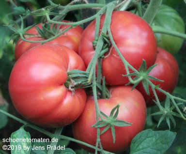 große Pflanze (1,8 bis 2,2 m) später Erntebeginn (Ende August) trotzdem sehr reicher Ertrag von durchweg gigantischen Früchten sehr große, breitrunde, leicht gerippte oder gedellte (da nicht zu saftig), rosarote Früchte größte geerntete Frucht: 685 g (2012), 671 g (2019) kräftiges Tomatenaroma, sehr fleischig Eine empfehlenswerte Sorte für Liebhaber von Riesenfleischtomaten! |
