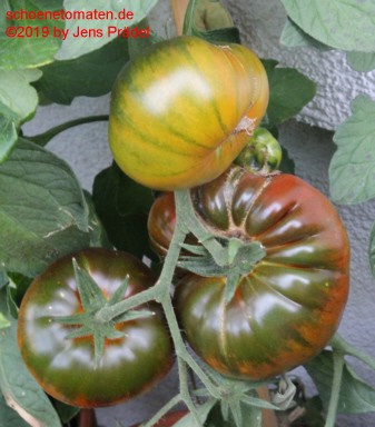 große Pflanzen (1,9 bis 2,1 m) 2012: sehr später Erntebeginn (Anfang September) 2019: mittelfrüher Erntebeginn (Mitte August) guter Ertrag mittelgroße bis große (ø 9 bis 11 cm, 6 bis 7 cm hoch), breitrunde, oft etwas unförmige, gerippte, unregelmäßig orange-rot gefleckte Früchte auch aufgeschnitten wunderschön rot-orange-gelb marmoriert Früchte enthalten nur wenige Samen. größte geerntete Frucht: 387 g (2012), 405 g (2019) Schmeckt wie Obst: süß, saftig und fruchtig! Eine wunderschöne und ausgezeichnet schmeckende Fleischtomate! |