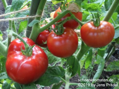 große Pflanzen (bis 2 m) früher bis mittelfrüher Erntebeginn (Anfang bis Mitte August) mittlerer Ertrag mittelgroße bis große, breitrunde, überwiegend oben gerippte, wunderschöne, leuchtend rote Früchte ausgezeichneter Geschmack, fruchtig, saftig mit leichter, angenehmer Säure prima Sorte |