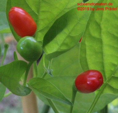 sehr kleine (ø 0,8 bis 1,5 cm und 1,5 bis 2 cm lang), leicht hochrunde, aufrecht wachsende, von grün über orange nach rot abreifende Früchte