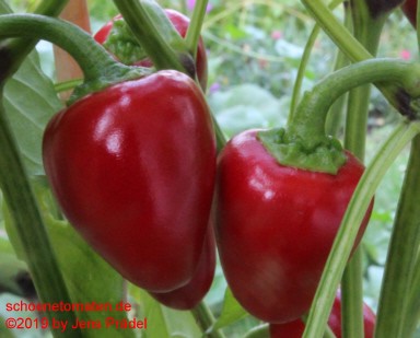 mittelgroße (ø 6 bis 8 cm und 10 bis 14 cm lang), sowohl blockige als auch spitz zulaufende, von grün über hellgelb nach rot abreifende Früchte