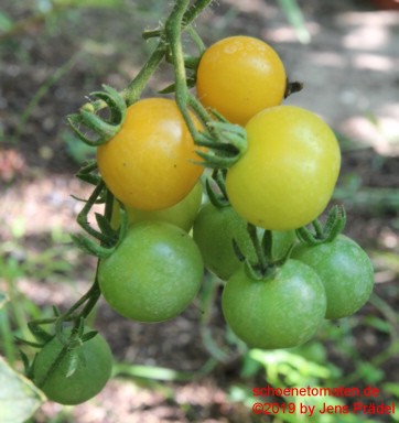 kleine (ø 2,3 bis 2,6 cm), etwa 3 bis 8 g schwere, runde, hellgelbe Früchte an seltsam verzweigten Rispen