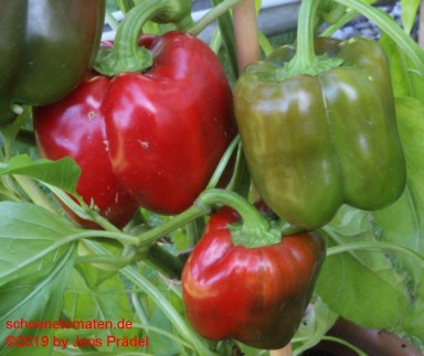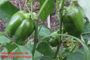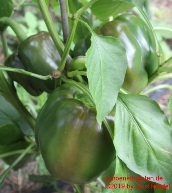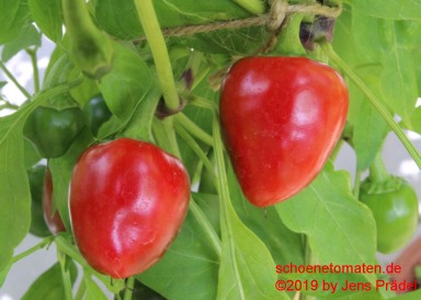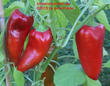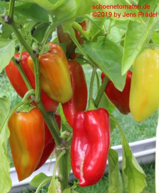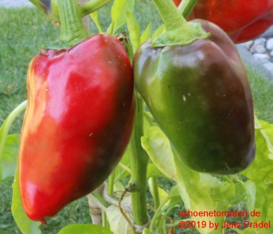 mittelgroße (ø 6 bis 8 cm und 10 bis 14 cm lang), sowohl blockige als auch spitz zulaufende, von grün über hellgelb nach rot abreifende Früchte