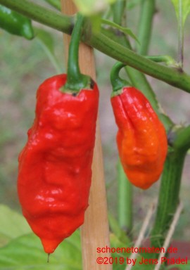 wunderschöne, meist ebenso breite wie hohe, extrem zerknautschte, teils wirklich lustig geformte, über orange nach rot abreifende Früchte