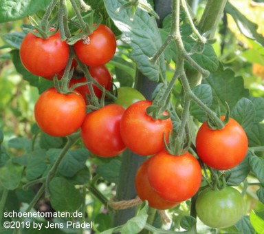 kleine (ø 4 bis 4,3 cm), 20 bis 30 g schwere, runde, rote Früchte an schönen, gleichmäßigen Rispen